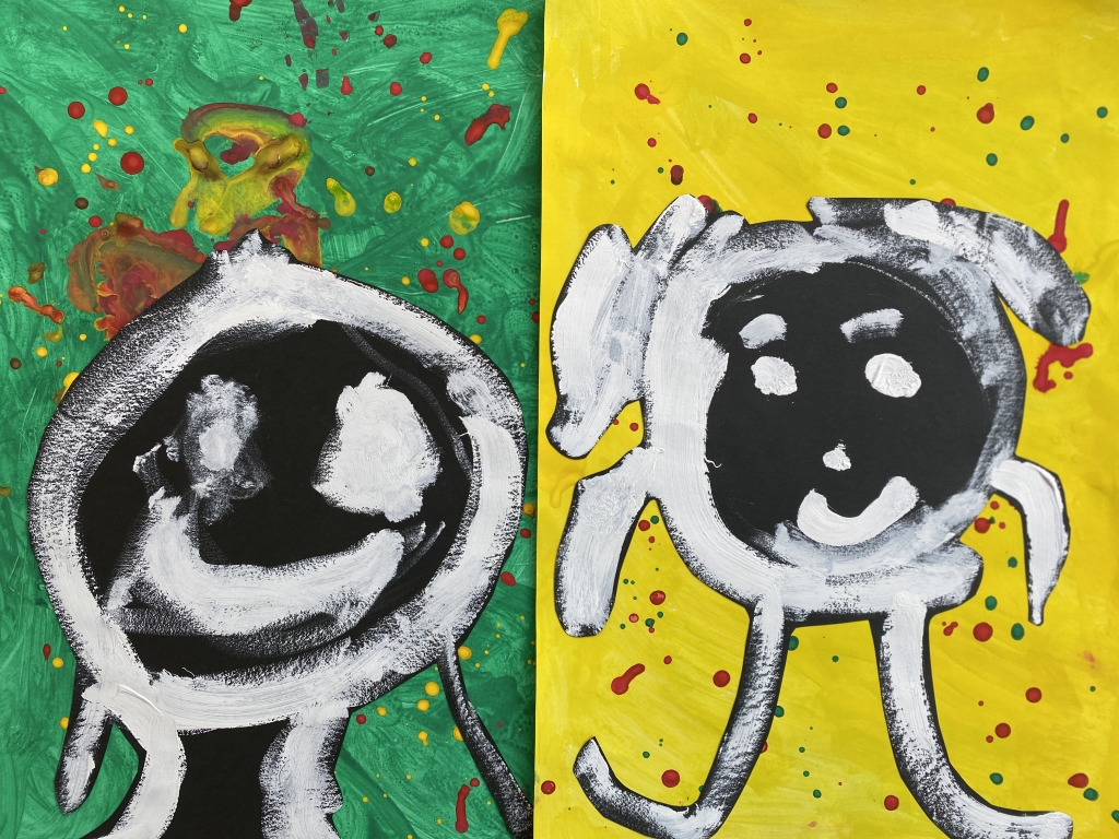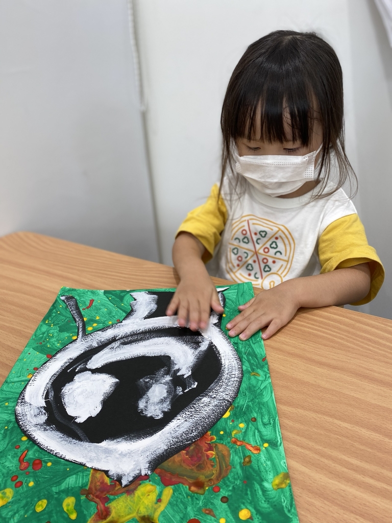 2週間に渡る今回のプロジェクト。1週目は、背景を作成しました。画用紙全体に絵具を塗った後、”Action Painting (Jacson Pollock)” というおもしろい手法で彩色しました。