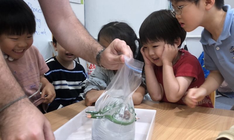 The children were wide-eyed and thrilled as the pencils slid through the bag, learning about how plastic can seal tightly around objects.