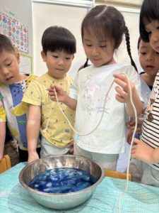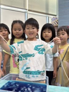 Iceの入ったWaterにSaltを入れるとなんと不思議!Waterがもっと冷たくなり、そこに紐を垂らすと紐とIceがくっついてIceが釣れました!