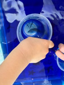 1つ目の実験は水といえばOcean!Oceanの中をコップで覗いてどんなSee Animalがいるか探してみました。