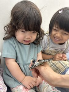 蝶を手に乗せて触れ合いました。