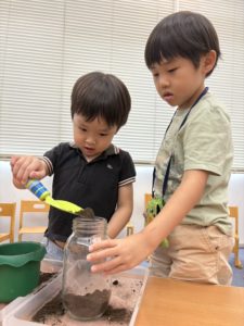 After finding some ants, we collected dirt and tiny insects to take back to the classroom. We carefully placed the dirt into jars to create a little home for our ants. Everyone worked together to make sure the ants would be safe and comfortable.
