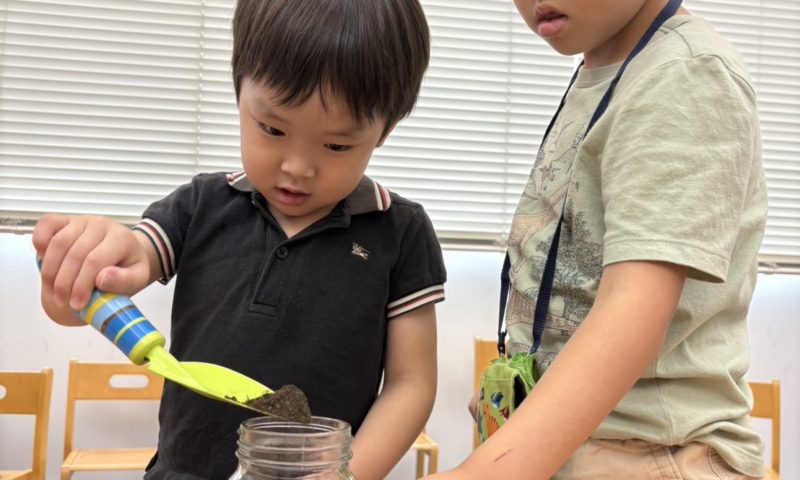 After finding some ants, we collected dirt and tiny insects to take back to the classroom. We carefully placed the dirt into jars to create a little home for our ants. Everyone worked together to make sure the ants would be safe and comfortable.