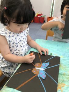 After our lesson, we created a special craft to see camouflage in action. We started with black butterfly cutouts and used pastel to color them with bright and creative designs.