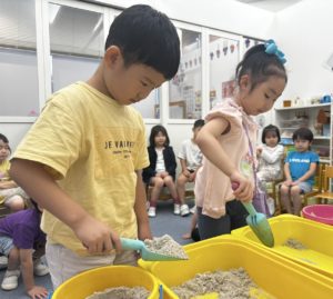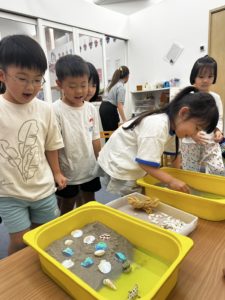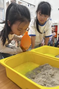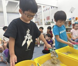 After learning about beaches, we worked together to create our own beach as a class. We started by pouring sand into a large container placed on the table to form our shoreline. It was exciting to see our beach begin to take shape as we built it step by step.