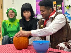 In the afternoon, we played a bowling game and then carved a pumpkin to make a Jack-o-lantern! We took turns removing the seeds and guts while the older students got a chance to carve it out.