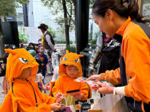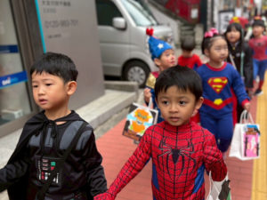Each student carried their own trick or treat bag, which they had designed earlier with ghosts, bats, and friendly monsters. Holding hands in pairs, they practiced English greetings and polite phrases as they visited nearby shops and businesses.