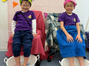 Next, the children soaked their feet in warm water. They laughed as the bubbles tickled their toes and talked about how nice it felt to relax.
