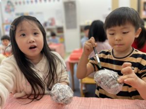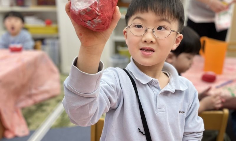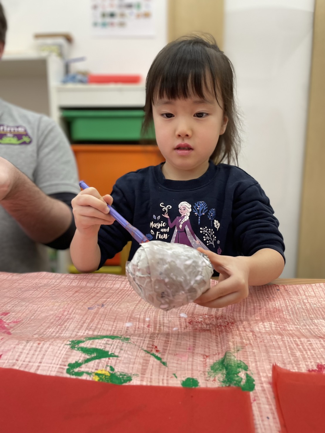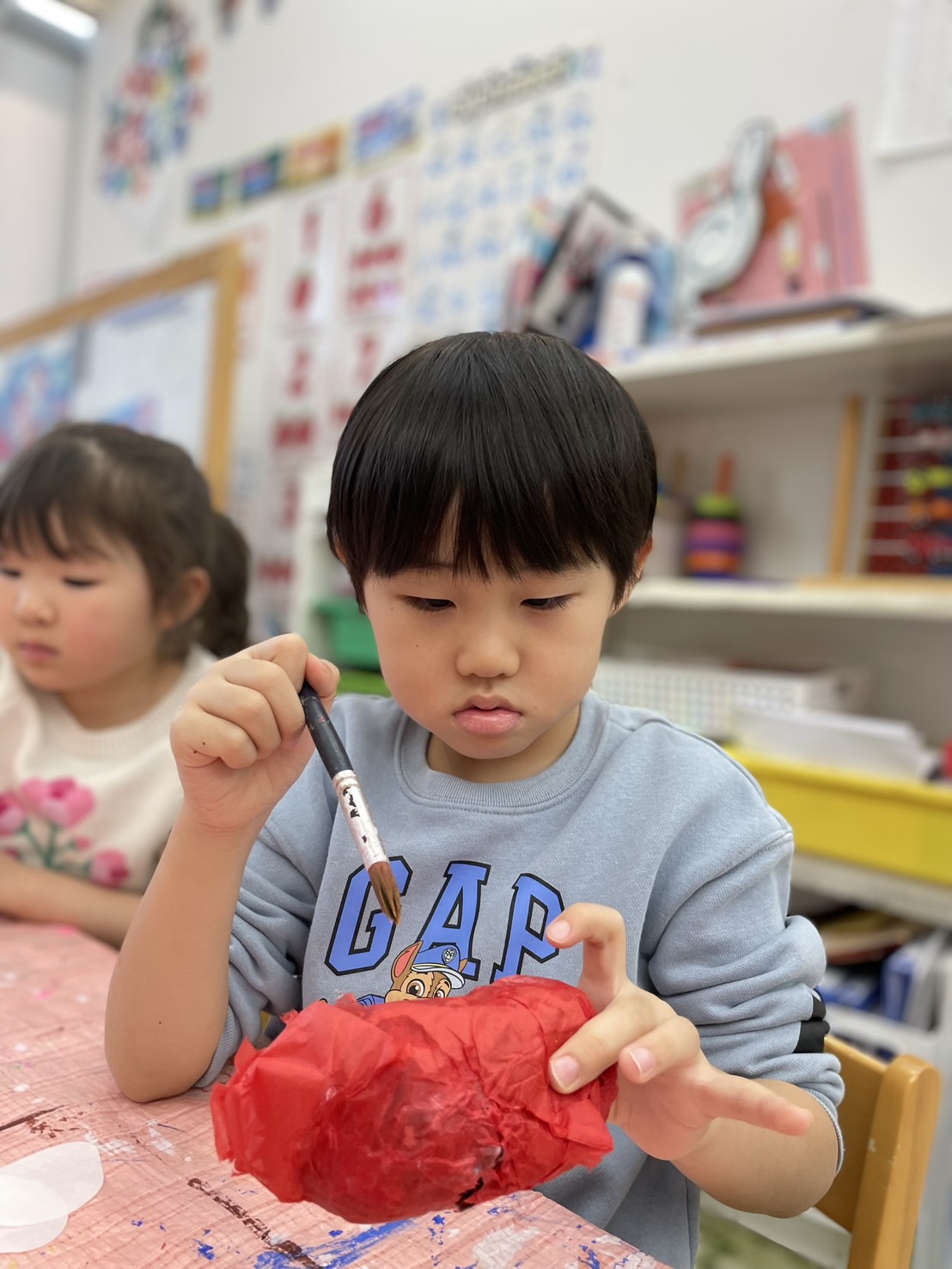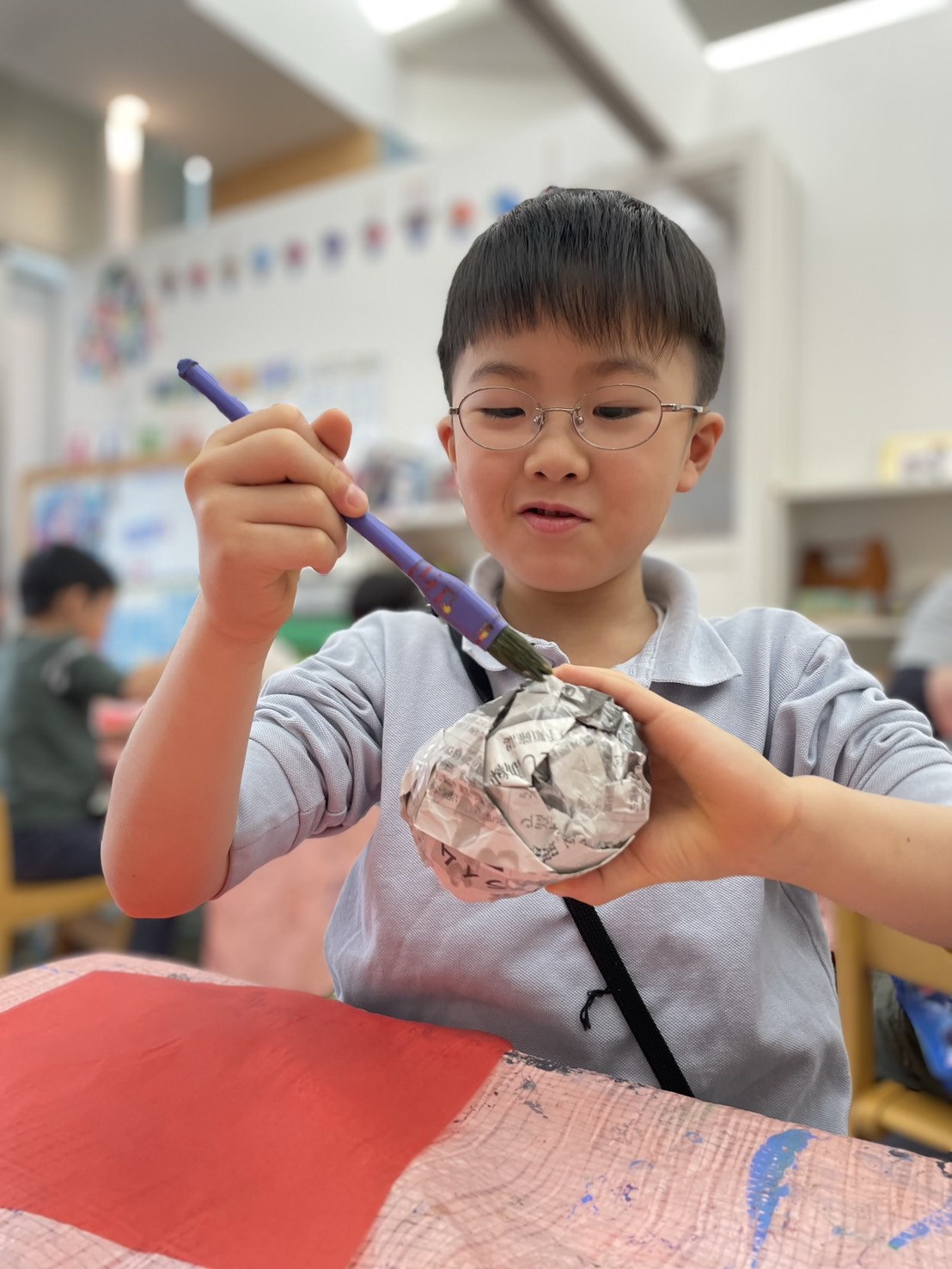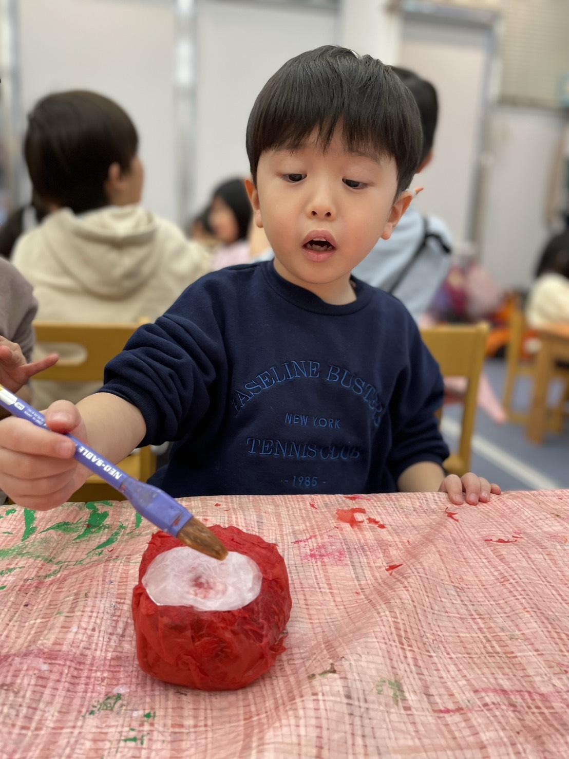 Next, we wrapped the ball with layers of red tissue paper. Everyone worked hard to cover the entire surface, pressing the tissue paper down and brushing more glue mixture on top to keep it smooth and secure.