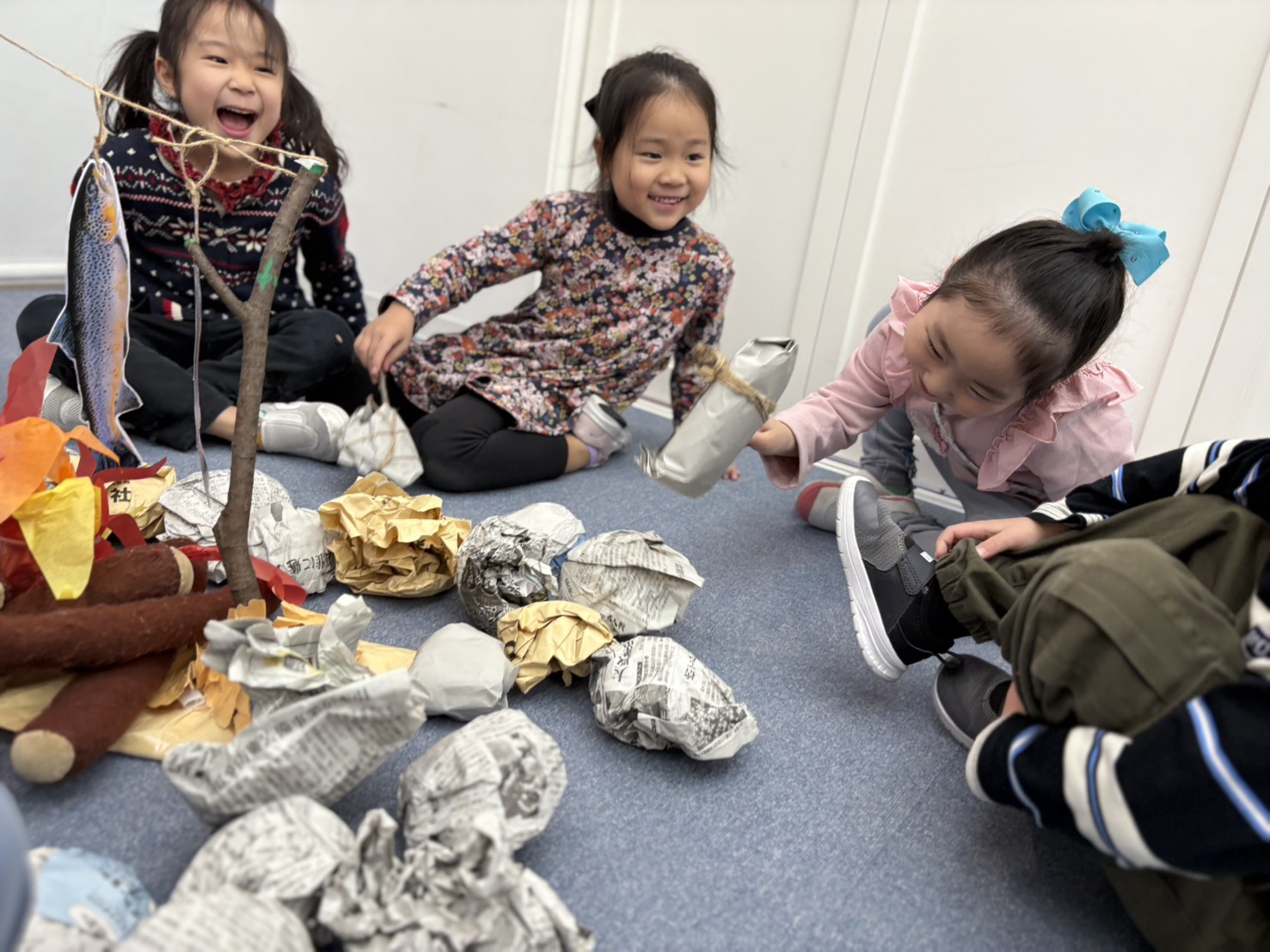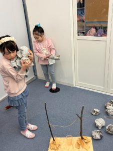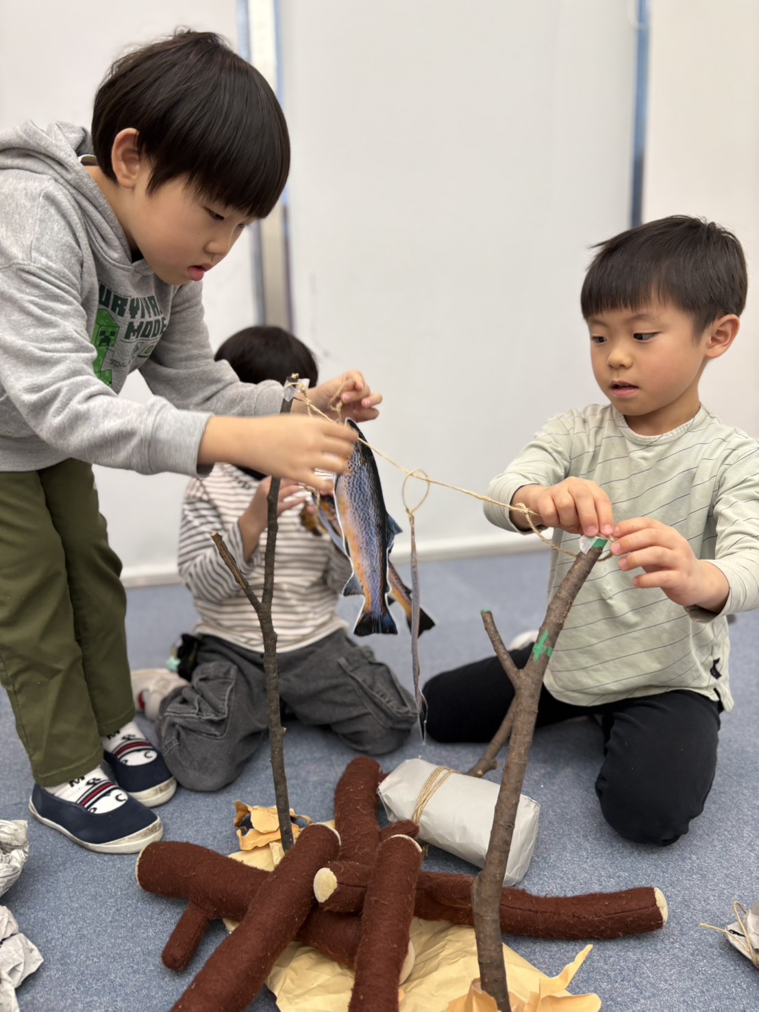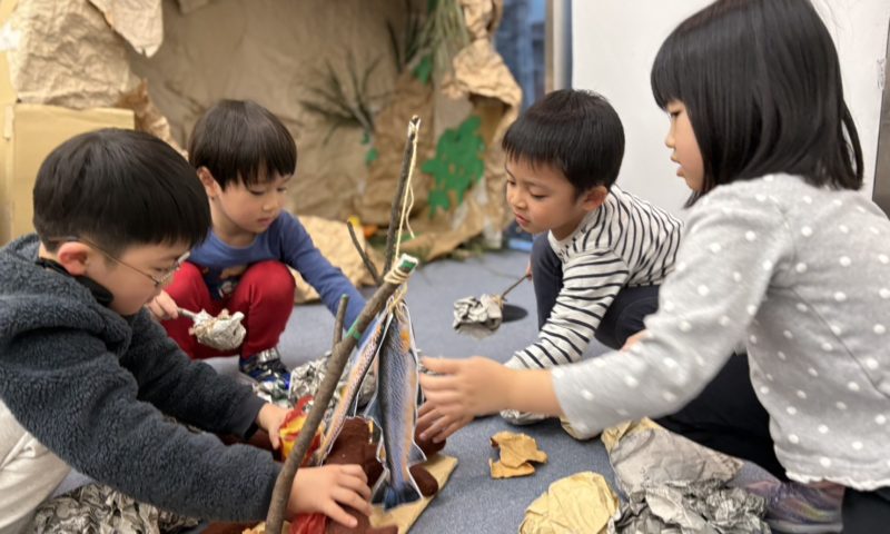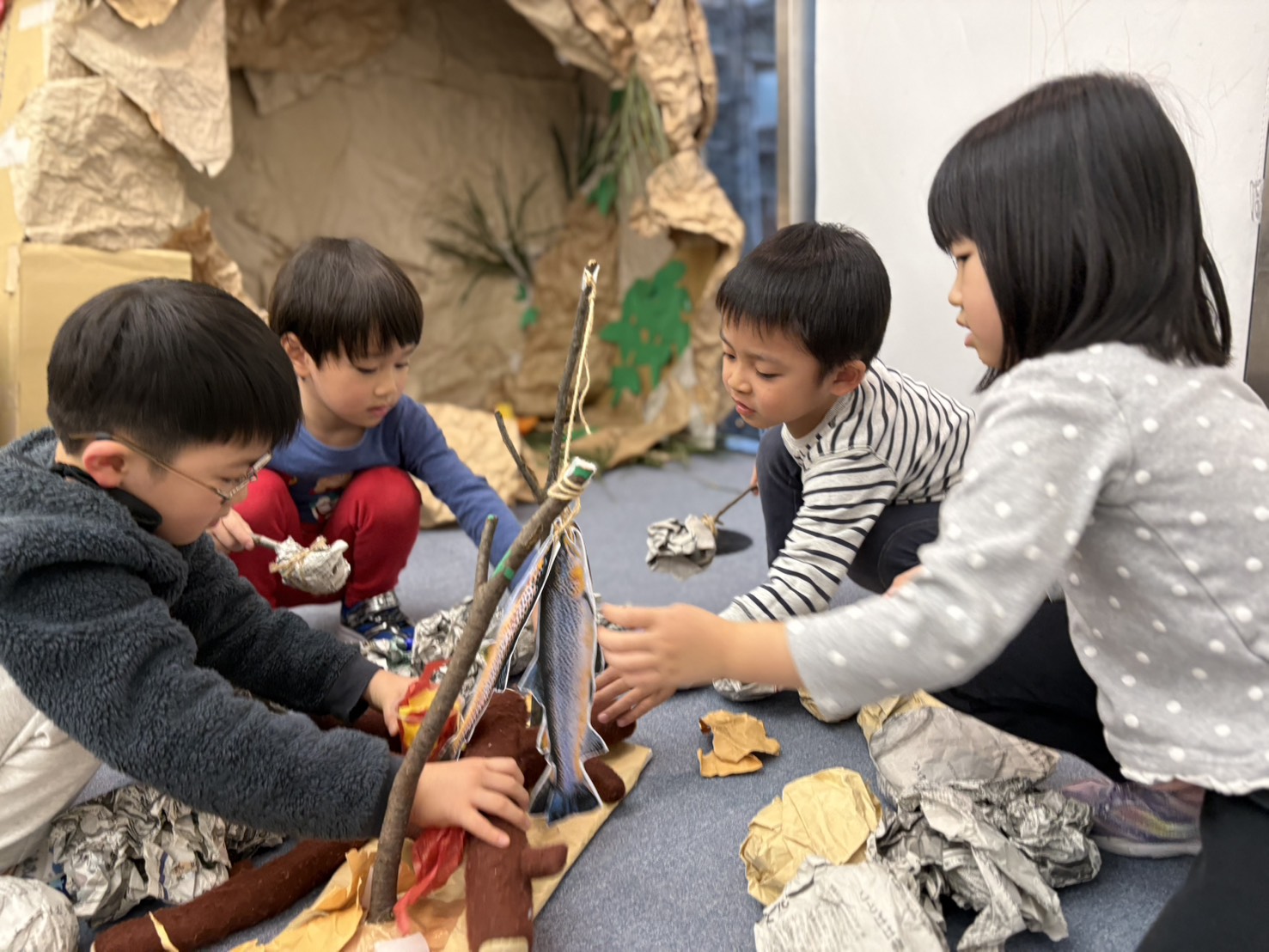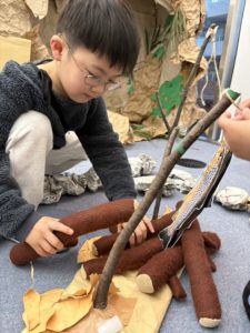 Students worked together to imagine they had gone on a fishing trip. Using sticks, paper, and other materials, they designed and created the fish they “caught,” thinking carefully about size, shape, and how it would be cooked.