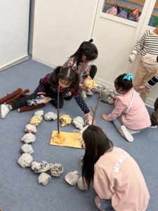 Next, we set up a Stone Age style campfire scene. The children helped build a roasting area using sticks and rocks, just like people might have done thousands of years ago.