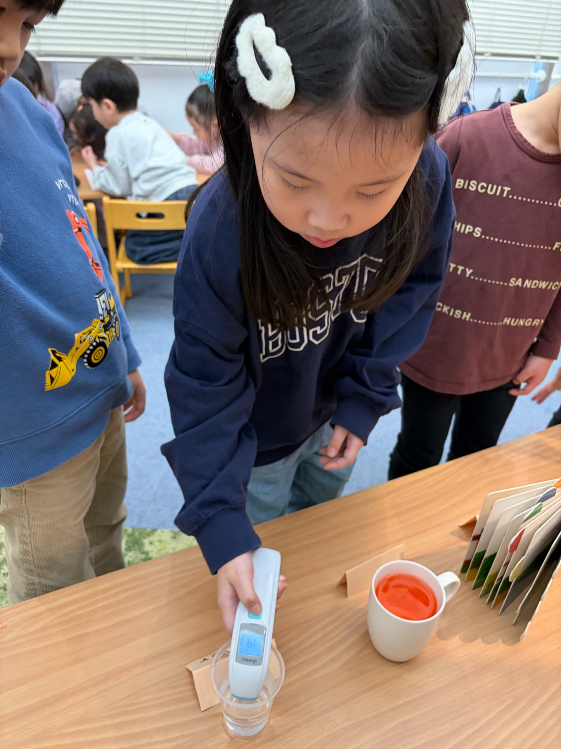 We measured the temperature of many different things. We checked hot tea, tap water, and even ice! It was fun to see the numbers go up and down on the screen.
