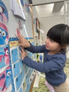 Another important part of our daily routine is our classroom calendar. Each day, the children get the chancd to come to the front and point to the correct date. They enjoy helping the class keep track of the days, and it is lovely to see how proud they are when they show their friends what day it is.