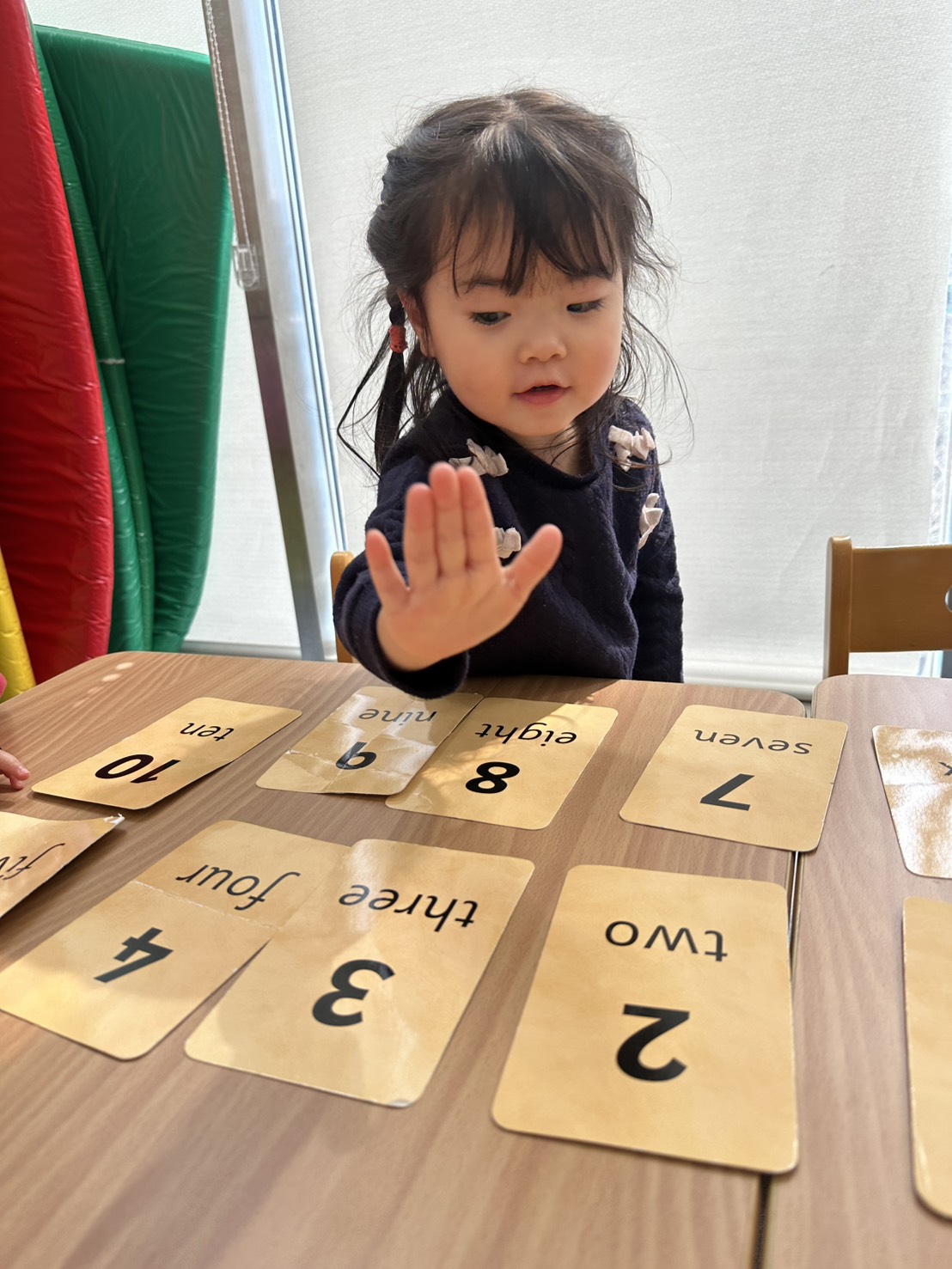 One activity we enjoy is practicing numbers and counting with large, tactile flashcards. The cards are laid out in front of each child, and they are challenged to point to the number that is called out. This kind of movement-based activity helps keep the students engaged while they strengthen their number recognition and counting skills.