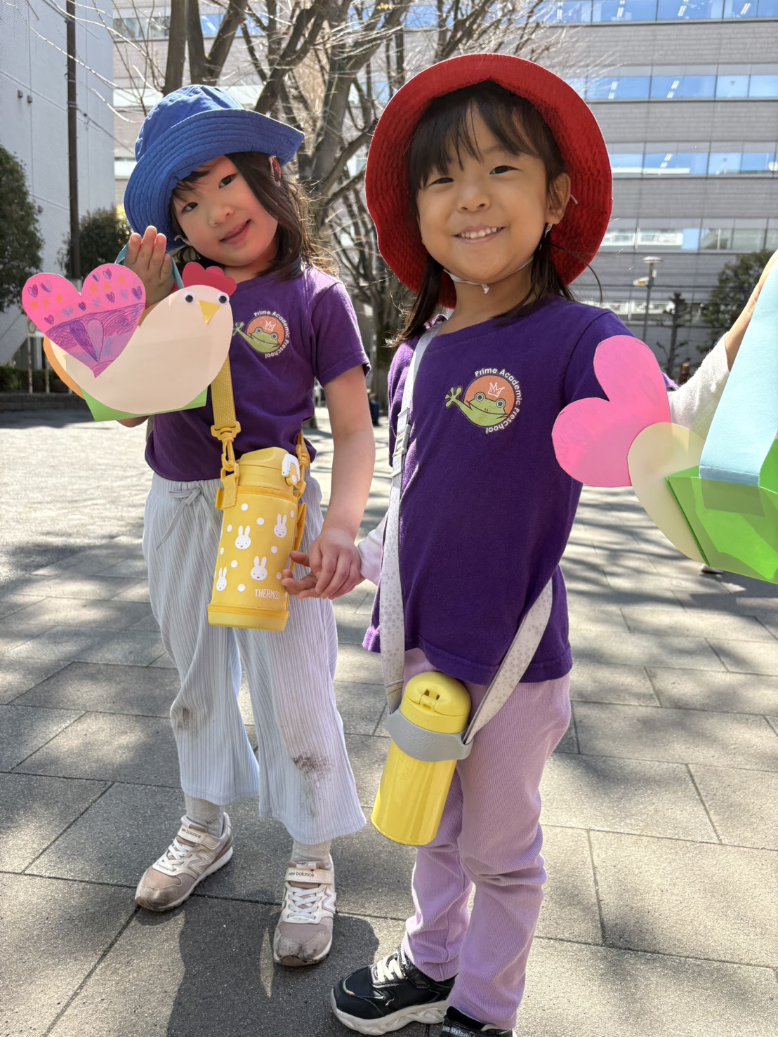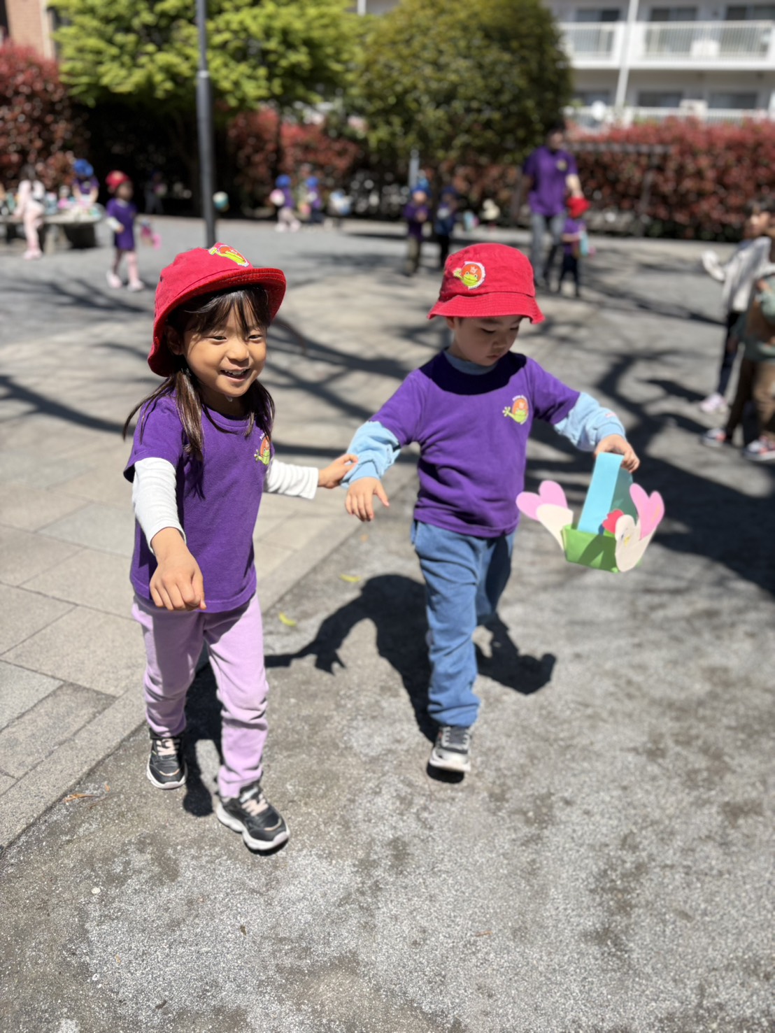 The children held hands and walked nicely together to the park. The weather was beautiful, and we even got to take a group picture with the lovely cherry blossoms along the way.